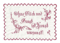 Zierdeckchen Rand bogenförmig; rot bestickt; Spruch: "Ohne Glück und / Gunst, / ist Kunst / umsunst!" -